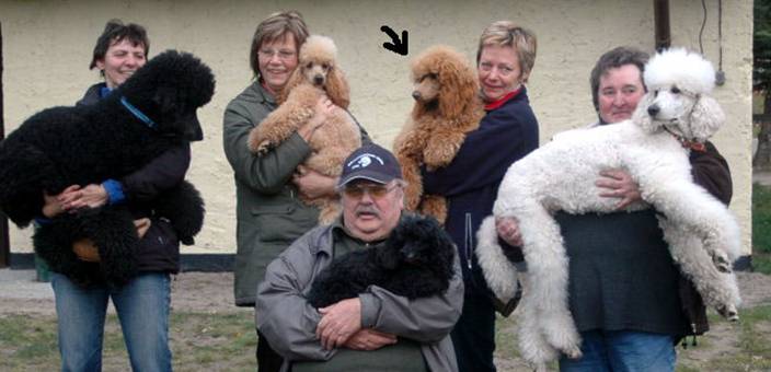 Herrchen und Frauchen sind aktive Mitglieder im Deutschen Pudel Klub (DPK). Hier ein Gruppenfoto mit einigen anderen Mitgliedern aus der Bezirksgruppe „Ueckermünder Heide“. Mummy and Daddy are aktiv members in the German Poodle Club (Deutscher Pudel Klub = DPK). Here we see a group photo with some other members of the poodle- district- group „Ueckermünder Heide“. |