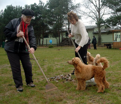 Auf dem Pudelplatz ist „Herbstputz“ angesagt. Bronco „hilft“ natürlich gerne! In autumn the area of the poodle– district– group have to be cleaned by the members. Bronco loves to „help“, of course. |
