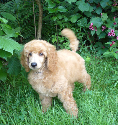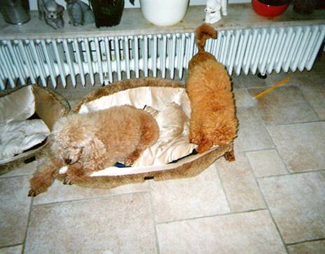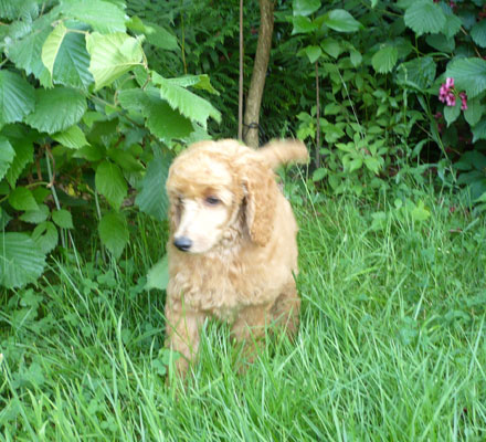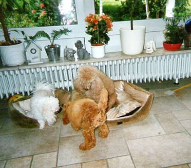 Sie wächst zusammen mit zwei Hunde- Kameraden auf: apricot Kleinpudel– Hündin „Xandrine von der Hundisburg“ und Bolonka– Hündin Ronja. She is growing up together with two dog– comrades: apricot miniature poodle bitch „Xandrine von der Hundisburg“ and Bolonka-bitch Ronja. |