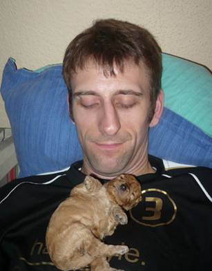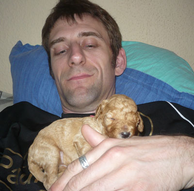 Wie man sieht, fühlt sich Püppy bei ihm pudelwohl. Like you can see is Püppy very pleased by this. |