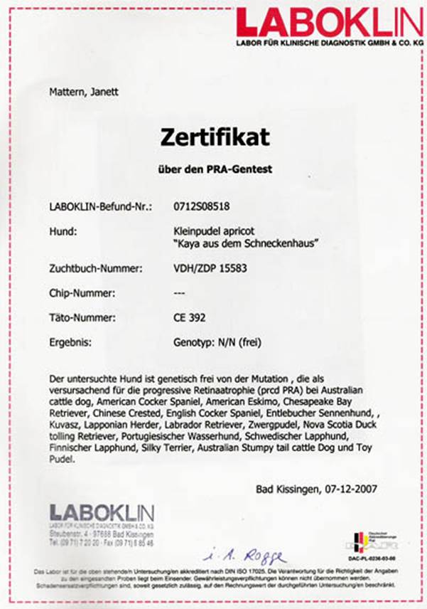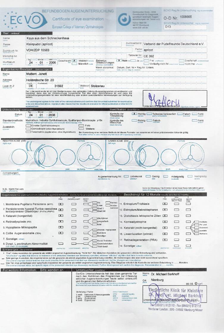 Both parents and their ancestors are regularly (all two years) examined for eye and knee joint diseases, and are healthy. Also one parent is tested for and FREE (A) of the Pathogenic gene for PRA, a hereditary eye disease, this meaning that PRA in this type is imposable for the puppies to have.