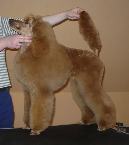 Head: long, slim and masculin Eyes: very dark and almond Ears: long, very good attached and carried Neck: very good necklength Pigmentation: black nose, lips– and padpigmentation Front: very good shoulder– and upper arm position, thus very good angulation, very good forechest Body: very good chest depth and wide brisket Back: straight, strong and short back Tail: excellent tailset with excellent tail carriage Hindquarters: very good hindquarter angulation Paws: excellent knuckled back feet very good knuckled front feet Coat: thick and profuse Colour: excellent strong, , saturate, warm and bright apricot colour Movement: very elegant with many reach and drive and with noble high head carriage Character: very kind, clinging and open nature with much temperament |