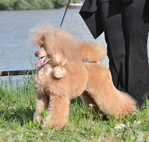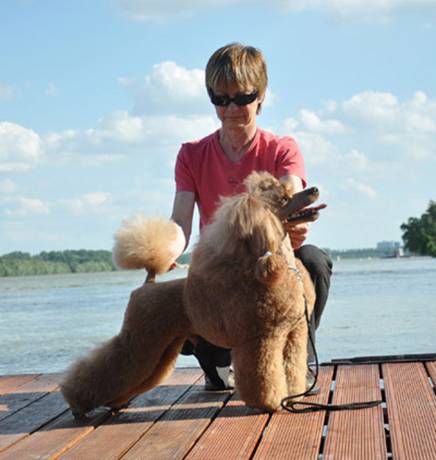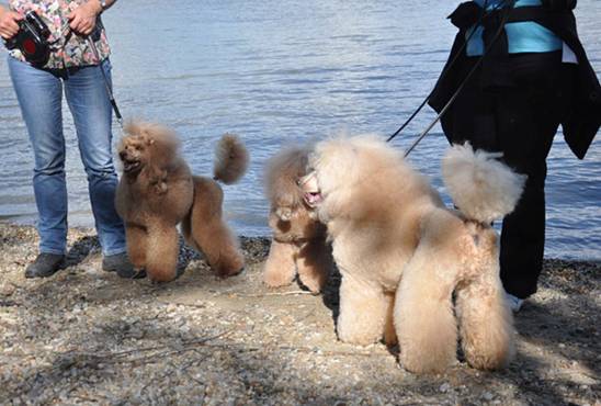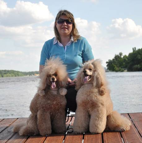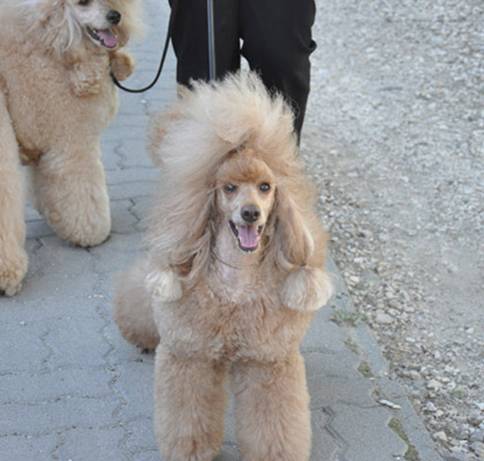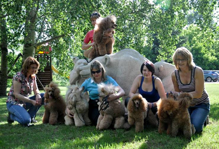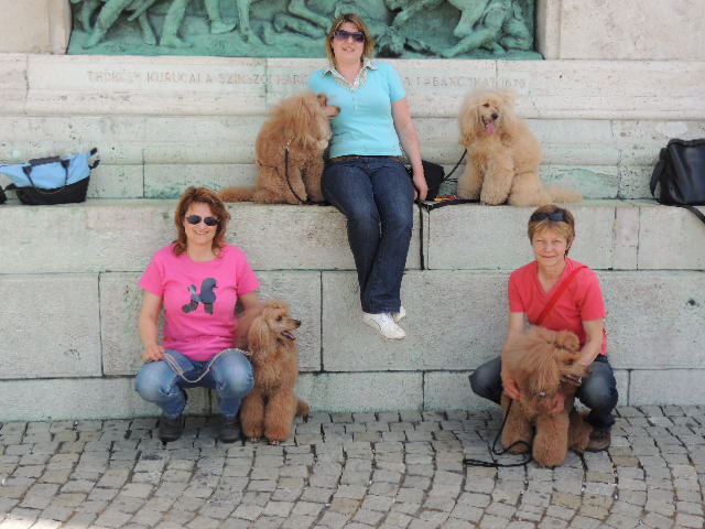 Ein Apricosen– Quartett als Pudelfamilie: Oben rechts sitzt Mama Gianna, oben links Töchterchen Susu. Unten rechts sitzt Buddy, Sohnemann von Gianna und Halbbruder von Susu. Und unten links sitzt Charmeur, Vater von Buddy. |
